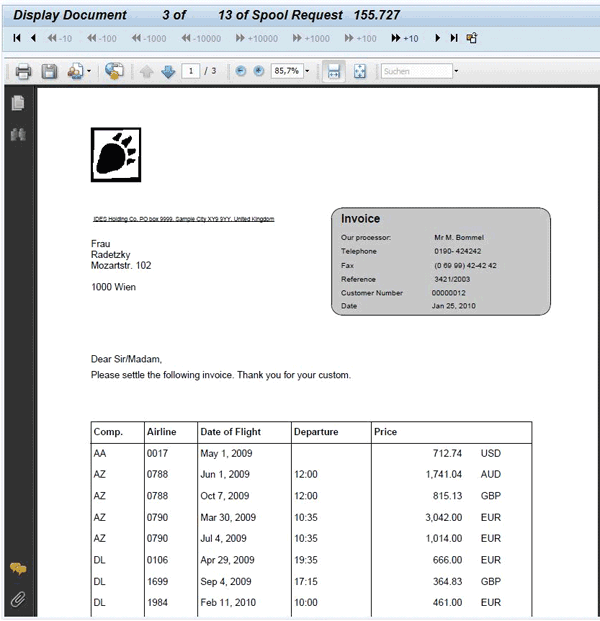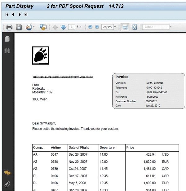 You can navigate forward and backward with the arrow buttons at the top of the window through the single parts of the whole spool request. The preview of the single parts is always shown as a PDF, regardless of the device type of the spool request. Before the PDF is shown, the system automatically makes an additional call to the ADS to generate the PDF file.