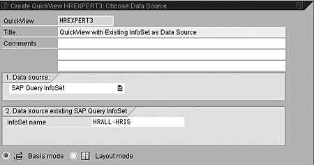 The data source selection dialog box (Figure 9) appears. Enter a title for your QuickView. For this example, I’m selecting the SAP Query InfoSet option. The bottom part of the dialog box now allows me to specify the data source name. In this instance, I chose an existing InfoSet I built for use with SAP Query reporting called HRALL-HRIS. This InfoSet is based on the logical database PNP. I also selected Basis mode and clicked on the enter key.