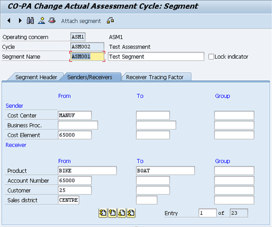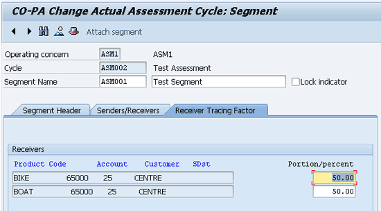 To define a CO-PA assessment cycle populate the G/L account in the assessment cycle. To define assessment cycles for allocation of cost from cost centers to profitability segments use transaction code KEU1. In the Senders/Receivers tab of the screen that appears (Figure 9) populate the Cost Center and Cost Element fields in the Sender section. In the Receiver section enter the CO-PA segment characteristics in the Product, Customer, Sales district, and Account Number fields.