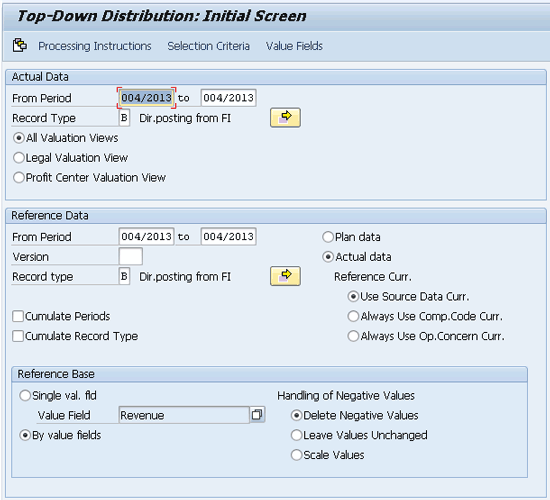 To execute top-down distribution use transaction code KE28 or follow menu path Accounting > Controlling > Profitability Analysis > Actual Postings > Period-End Closing > Top-Down Distribution > KE28 – Execute. The screen that appears (Figure 11) shows you the period for which top-down distribution is executed, the record types that need to be distributed, and reference data details.