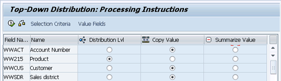 After you populate the fields necessary for top-down distribution shown in Figure 11, you are ready to set up instructions for processing. To complete this process, click the Processing Instructions button on upper left section of the screen shown in Figure 11 or press the F6 key on your keyboard. In the screen that appears (Figure 12) note that for the Account Number characteristic, the radio button is under the Copy Value column. Selecting this button ensures that the characteristic values from the distributing CO-PA lines are retained in the distributed CO-PA lines. Click the execute icon