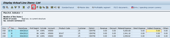 After you populate the G/L account characteristic for the various scenarios using the various techniques that I described, you can use custom reporting logic in SAP ERP Central Component (SAP ECC) or SAP Business Warehouse (BW) to generate profitability reports by account, thus mimicking the externally published P&L reports. I demonstrate how the results can be realized using a smaller set of data extracted from a CO-PA line-item display via transaction KE24. To execute transaction KE24 click the spreadsheet icon highlighted in Figure 13. The output can be extracted into an Excel spreadsheet. Using the data in Excel format, I have used the Pivot table functionality to generate the profitability report using G/L accounts in a venture to report with layout similar to externally published statements as shown in Figure 14.