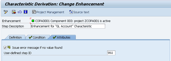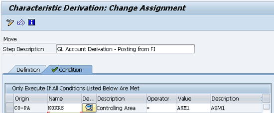 Click the Condition tab. In this tab you can maintain a condition that is prerequisite for this derivation to work. For example, I want this derivation to work only for Controlling Area ASM1, so I maintain condition Controlling Area equals ASM1 for the derivation to trigger. This can be done by entering CO-PA in the Origin column, KOKRS in the Name column, = in the Operator column, and ASM1 in the Value column (Figure 7).