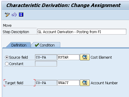 For Revenue/Credits/Consumption Posting from FI scenarios, you use the derivation type Move to populate the characteristic G/L account with the value in the fixed characteristic cost element. To use the derivation type Move, use transaction code KEDR or follow menu path SPRO > SAP Customizing Implementation Guide > Controlling > Profitability Analysis > Master Data > Define Characteristic Derivation. Click the create icon