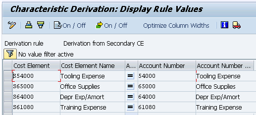 CO-PA assessments are posted using secondary cost elements of cost element category 42: Assessment. A derivation rule can be set up to map the secondary cost elements to a G/L account as shown in Figure 8.