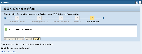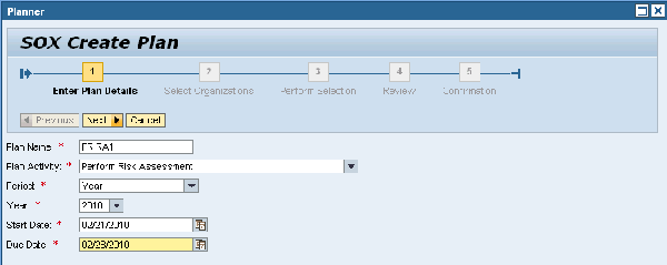 The Sarbanes-Oxley internal control manager kicks off the risk assessment using the guided procedure in five steps provided by the Planner feature available via menu path SOX > Evaluation Setup > Planner for subprocesses: