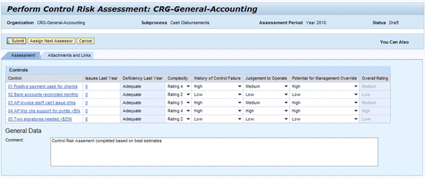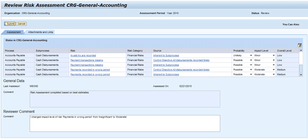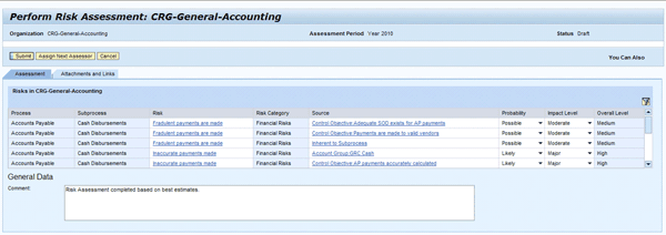 In the SAP BusinessObjects Process Control data model, subprocesses are associated with risks that are either inherent to the subprocess itself, or are assigned via account groups and control objectives. The second scoping step consists of an assessment of these risks with the objective to evaluate a risk level for each risk. The risk assessment is executed in a sequence of workflow steps for the given compliance initiative (e.g., Sarbanes-Oxley).