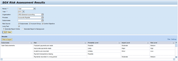 The risk assessment concludes when the Sarbanes-Oxley internal control manager accepts the risk assessment with or without changes. The results from the risk assessment are accessible through IMG menu path SOX > Report Center > Evaluation > Risk Assessment Results (Figure 13).