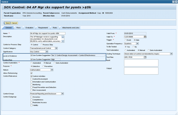 During master data setup, controls are associated with a subset of the risks that are tied to their subprocesses either inherently or via control objective or account group assignments. As a result of the risk assessment, each of these risks is associated with a rating for its overall risk level (Figure 13). The system combines the risk and control risk levels for each control and each risk associated to it and calculates the level of evidence needed by the regulatory requirements for the given control (Figure 16). You can customize the available levels of evidence by following IMG menu path GRC Process Control > Scoping > Set Level of Evidence Value. The system comes with the following preconfigured levels of evidence: