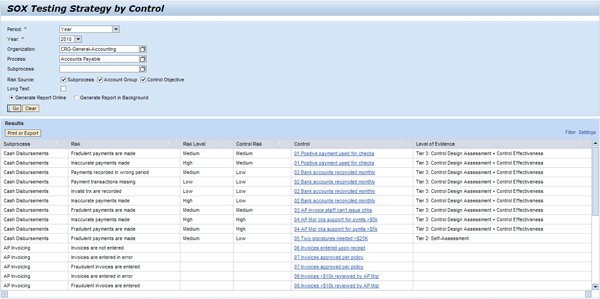 You can customize how the system combines risk and control risk levels to a resulting level of evidence by following IMG menu path GRC Process Control > Scoping > Set Level of Evidence. The level of evidence identifies high, medium, and low risk areas and implies a test strategy as mentioned above. You can access a report that summarizes for each control the results from the risk and control risk assessment and displays the resulting level of evidence by following menu path SOX > Report Center > Evaluation > Testing Strategy by Control (Figure 17). The system displays the level of evidence with the master data of each control (Figure 15).