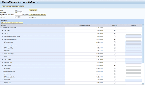 Log on to SAP BusinessObjects Process Control and open the Global Compliance Office to perform the consolidated level materiality analysis. Choose Global Compliance Structure > Accounts > Consolidated Balances and Significance (Figure 2). This screen lists your account group hierarchy as defined during master data setup. For each account group, enter the consolidated balance manually, or upload it via the predelivered template. The information collected is time frame and currency dependent. Enter a significance threshold that controls the inclusion of significant accounts on the corporate level. The determination of the significance threshold is executed outside the system and agreed on with your external auditors. Click the Apply Significance Threshold button and the system marks as significant all account groups with balances equal or higher than the threshold. You can also manually tag additional account groups as significant and provide a reason. Save and exit the screen. This prepares the system for the second step, the compliance and organization specific materiality analysis.