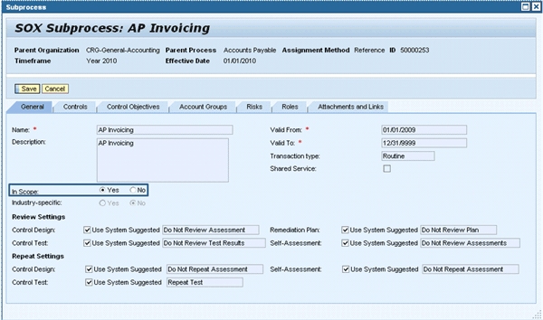 I’ll explain in the following sections how the scoping instruments mentioned above work in detail and provide some remarks on the required customizing, which generally is easy in nature. As a prerequisite, I’ll assume that your compliance initiatives and master data in terms of organizations, subprocesses, controls, account groups, risks, control objectives, regulations, and their relationships have already been set up in your SAP BusinessObjects Process Control system.