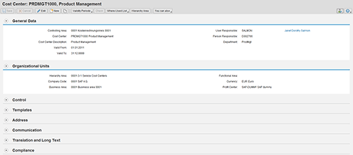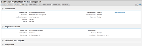 I select the details for the cost center PRDMGMT1000. The default screen appears (Figure 11). If you’re moving from an existing environment, be assured that all the existing fields in the cost center, including those activated using user exit COOMKS01, are available in the new application. SAP has also moved the texts from table CSKT to the panel Translation and Long Text so that you can maintain texts in multiple languages in one session. This feature brings the cost center master data in line with account maintenance in FI, thereby facilitating processes for controllers working in multiple countries.