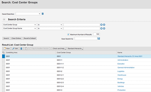 To change the cost center, choose the Edit button. To create a new one, select the New button, and to create a new cost center with reference to the selected cost center, click the copy icon. If you want to search according to different criteria, choose the + button and select another field such as controlling area, company code, business area, cost center category, user responsible, profit center, or department and enter the relevant search criteria.