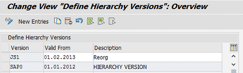 You also notice a new button called Select Hierarchy Version in Figure 16. The idea behind this button is that you can prepare your reporting hierarchies for organizational changes before they happen. To create a new version in anticipation of a reorganization, follow IMG menu path Controlling > Cost Center Accounting > Master Data > Cost Centers > Define Hierarchy Versions. Enter a new version. In my example, I enter a version JS1 to be released on 01.02.2013 (Figure 17).