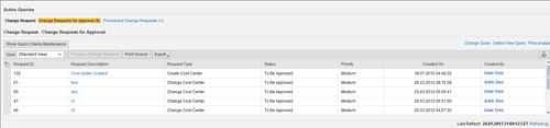 I now use the Cost Center Manager role that I referred to earlier to select and approve the change request. Figure 21 shows the approver worklist (Change Requests for Approver) within the cost center manager role. You also notice a second worklist showing those requests submitted by this user (My Change Requests).