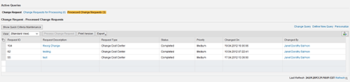 However, note that the worklist includes two views: one for requests requiring processing and another for completed change requests. These views ensure that you can satisfy compliance requirements for proper change management around cost center changes. Figure 24 shows the list of all completed change requests. Clicking the request takes you into the form with details of why the change was necessary.