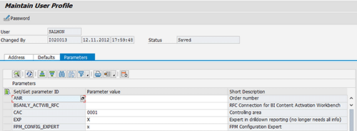 The Web Dynpro applications are now active. Your final step is to determine which controlling area your controllers should use by entering the relevant controlling area in the user settings Choose System > User Profile > Own Data. Click the Parameters tab and enter the Set/Get Parameter CAC for the controlling area and the number of your controlling area (Figure 7). If it’s not shown enter this parameter manually, but because it dates back to the early days of SAP R/3, you may find that it is already set for your user. You also notice that I have a new parameter, FPM_CONFIG_EXPERT, that allows you to configure the user interfaces in this test system. I discuss this interface later.