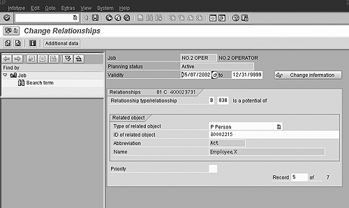The default job is always defined through the hiring event, as part of the process of describing the position that the employee fills in the organization. For example, in the Organizational Assignment screen shown in Figure 2, employee number 80002215 (Employee X) is attached to a position called CONTROL OPERATOR (S 40001113) described by a job called Op. Z (C 40003316).