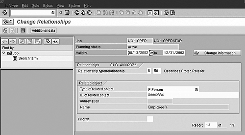 A rate protection is similar to a potential job. It is defined for an employee, and through a relationship with the job. The relationship used in this case is a custom one, called Describes Protec Rate for. Figure 4 demonstrates how Employee Y is linked to the job of NO 1 OPERATOR via a rate protection relationship (the practice of guaranteeing a worker a particular rate regardless of the job being done is known as rate protection).
