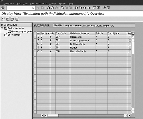 To define evaluation paths, follow the IMG path Personnel Management> Organizational Management>Basic Settings>Maintain Evaluation Path or use transaction code OOAW. The evaluation takes place from top to bottom in the sequence of the numbers entered in the path definition. The path definition may consist of several lines. Each line relates one type of object to another type from left to right, via a relationship. You can chain relationships by relating the object type on the right of a line to another object type in the next line. The leftmost object of the first line is the root from which the evaluation starts. In the example in Figure 9, the organization is related to a position, the position is related to a job (default) and also to a person, and finally the person is related to another job (potential).