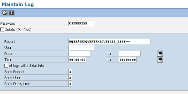 You can delete the log for one report at a time or for multiple reports executed by a single user at a time. In this case, you leave the Report field blank. If you want to delete multiple reports by a user on different date ranges, you need to mention the required date ranges in the date field. You must enter the user ID in the Password field. Otherwise the system does not run this program.