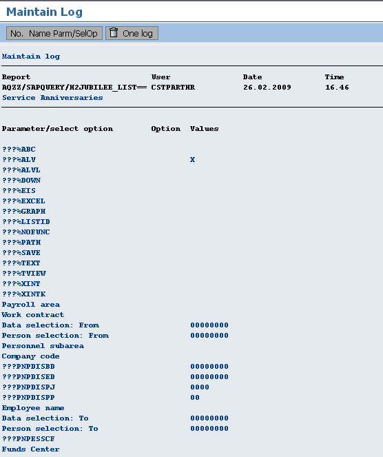 The Parameter/select option refers to the user’s original parameters and selection options used while running the report. This information helps the audit team discover for which company code, employee group, and employee sub group this report was run. For example, if the user ran this report for company code 1000, with selection option 1000, then this company code appears in the option values.