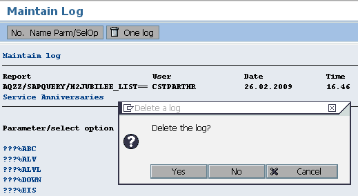 If you click the Delete button the system gives you the pop-up dialog box asking if you want to delete the log (Figure 8). If you click Yes, the system deletes the log information stored in report RPUPROTD. You can also delete this information by choosing the Delete check box in Figure 5. This screen is captured so you can examine the log before you delete it.
