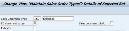 In the Change View screen enter ZEX in the Sales Document Type field (Figure 1). ZEX is a copy of the standard return order (RE). Enter a description for the sales document type (e.g., Exchange). Enter H in the SD document categ. field. Click the save icon to save your entries.