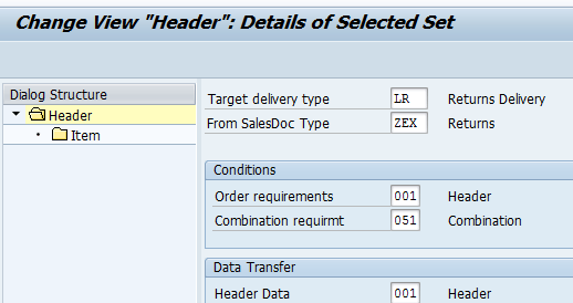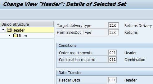 In the screen that appears, go to order type ZEX by clicking the Position button at the bottom of the screen (not shown) and type ZEX in the SalesDoc Type field. Scroll down to the Shipping section (Figure 11). Only one delivery type can be defaulted in any order type. Your business policy either could be to do the return first or send the replacement first. Based on which policy you follow, put the appropriate code in the Delivery type field in the configuration for the order type. In my example I entered LR in this field. Click the save icon to save your entry.