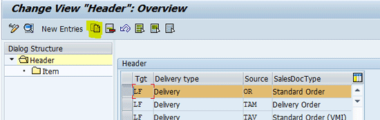 To specify the copy control for deliveries, copy control from the ZEX sales order type to standard delivery type LF (e.g., OR to LF copy control) as shown in Figures 7 and 8. Click the Position button (not shown) and LF in the Delivery type field and OR in the Sales Doc Type. Press Enter. In Figure 7 Select the row with LF in the Tgt column and OR in the Source column. Click the copy icon.