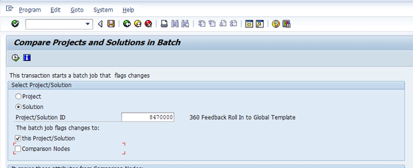 The Compare Solution function shows that there has been a change between the solution and source project. From the Solution Directory (transaction code SOLMAN_DIRECTORY), select the solution and follow menu path Utilities > Compare Solution. Be sure to select the Solution radio button to compare changes in the solution (Figure 1).