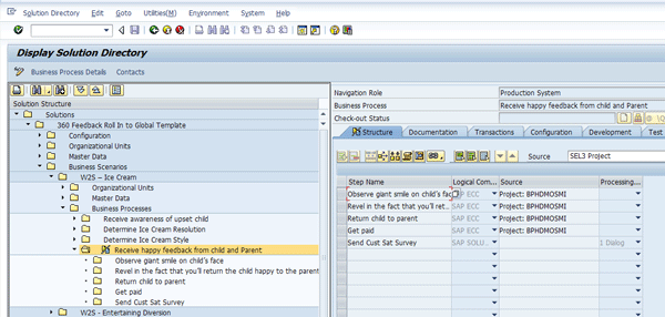 In Figure 2, a new process step has been added in the solution as part of a business enhancements release (a minor release performed outside the scope of a project). The example I’m using is for a fictitious company called Child Management Services, Inc., which provides summer day camp for children and is explained in detail in my article “How SAP Solution Manager Can Lead Your Company to Business Process Excellence.” The process step Send Cust Sat Survey has been a step added to the business process Receive happy feedback from child and Parent in the BPH structure, and a transaction added to the step. This indicates that there was a process enhancement implemented since the original design was delivered to the solution.