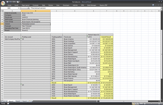 Figure 3 shows the report with the solution. This solution enables a BEx report to retrieve only the elimination entries with the trading partners under the same consolidation group (SEG in this example) input to the variable by a user. It is the same result that a SEM-BCS report has. Compare the PL 20 data in the red box with the data in Figure 2.