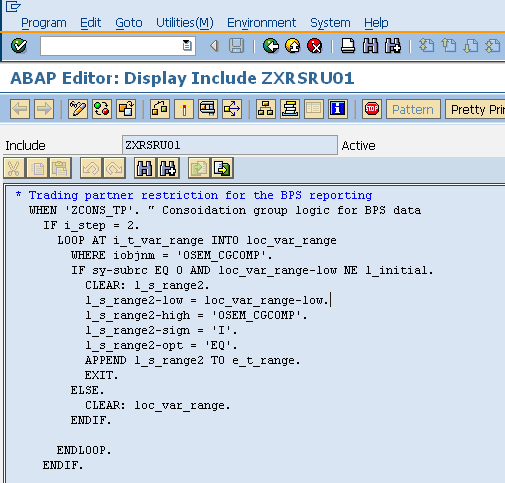 Step 4. Create user exit variable for the trading partner (hierarchy). This variable is used in restricted key figure 2 (step 5). This gets the same consolidation group value as the user input to the variable that you created above step 1 for the trading partner company hierarchy. Refer to the example of code at the end of this document.