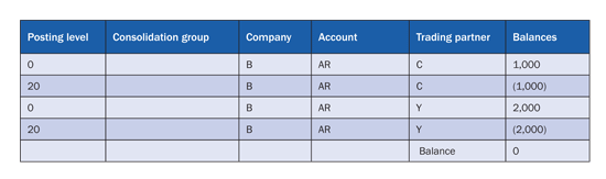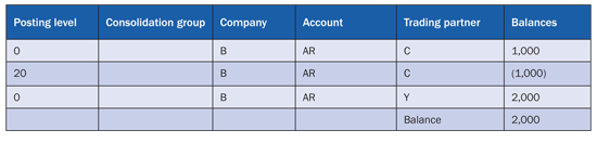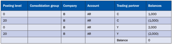 Consolidation unit B has the balance of account receivable $1,000 with consolidation unit C and $2,000 with consolidation unit Y. After you execute the elimination task using the consolidation monitor of SEM-BCS, the data listed in Table 1 is generated in the SAP SEM-BCS total InfoProvider. (Note: the data doesn’t appear in the SEM-BCS reporting InfoProvider.)