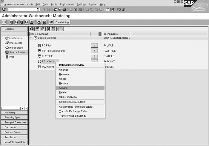 After upgrading R/3 with the new plug-in, you need to activate the source system connection from BW. Use transaction RSA1 and follow menu path Modeling>Source Systems>R/3SOURCESYSTEM. Right-click to display the context menu, select Activate (Figure 14), and the system displays the pop-up window in Figure 15. Click on the Replicate As Well button to replicate the DataSources.