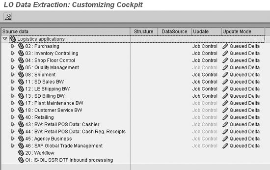 Use transaction LBWE to deactivate the extract structures. Expand the logistics application hierarchy tree to view all extract structures for an application. Figure 13 illustrates the process for 02 (purchasing) applications. First, make a list of all DataSources in Active status from all applications. Use the Update column of Figure 13 to make this list. You’ll use this list to make the active DataSources inactive in the next step.