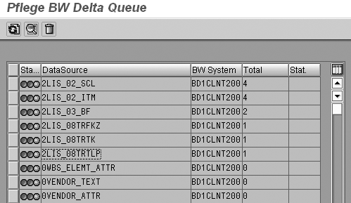 In R/3, run transaction RSA7. You need to make sure that all DataSources have the value of 0 in the Total column. The value 0 indicates that the delta queue is empty for the DataSource. To verify this setting, use transaction RSA7 to see the screen in Figure 8. Your R/3 system maintains this number in the Total column, so you cannot change it. If the value in the Total column is not 0, you need to pull the delta again and ensure that this value changes to 0.