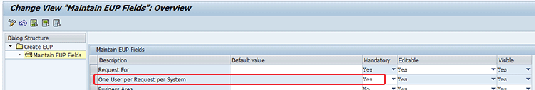 You can navigate to the implementation node for the maintenance of EUP settings via menu path SPRO > SAP Customizing Implementation Guide > Governance, Risk and Compliance > Access Control > User Provisioning > Maintain End User Personalization (Figure 10). The field One User per Request per System in the EUP setting controls whether you can create multiple access requests for a user per system or not. The default value of this parameter for the Mandatory attribute is Yes, so users are quick to conclude that it is not possible to have multiple requests per system.