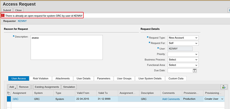 Figure 11 displays with an error message when you attempt to create an access request when there is an existing access request pending an approval decision for a user for a particular system. To allow multiple access requests for a user per system, change the value of the Mandatory attribute to No. For this EUP setting the default value and editable and visible attributes are not modifiable because these attributes are not fields.