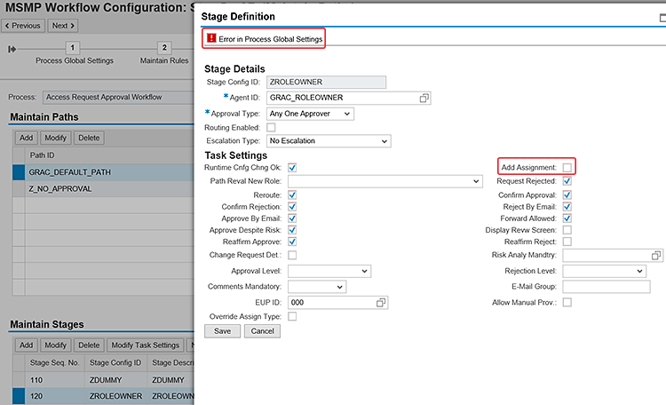 Click the Save button. Figure 13 displays with the error message Error in Process Global Settings. Also, the Add Assignment check box (formerly checked) is unchecked automatically.