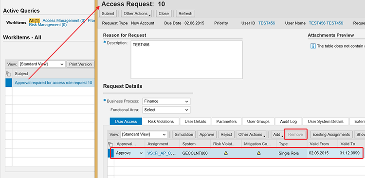 The approver can only remove the role he or she added to the access request at the approval stage and not roles added by the requestor. Roles can be removed only by the requestor before submission of an access request or by the approver (for roles added by him or her) before approval of the access request. Figure 15 shows where the approver added the highlighted role to the request in Figure 14. Observe that the Remove button is now active.