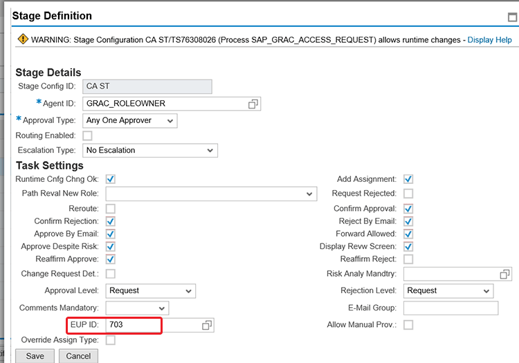 To control what user details an approver can change in the approval screen, the EUP settings can be maintained appropriately. The maintained EUP settings have to be associated with the MSMP stage task settings as shown in Figure 16 for a custom EUP setting 703. The definition in the EUP settings makes fields visible (or invisible), editable (or un-editable), and mandatory (or optional) as the case may be.