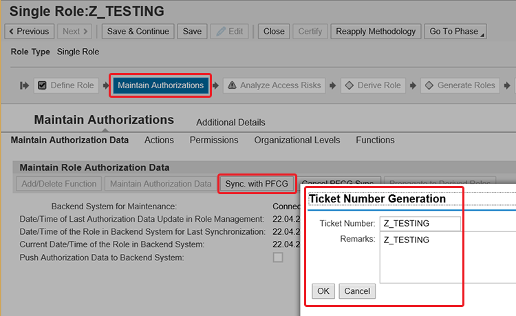 To further document changes made to roles, especially the authorization data with a reference, configuration parameter 3008 needs to be set to Yes. (A ticket number is required after authorization data changes.) This allows the documentation of a ticket number that can in turn be captured in the change log report against the authorization data changes to provide an audit trail. The ticket number generation window (Figure 18) is triggered any time the button Sync. with PFCG is clicked in the role maintenance window. A change log of roles for authorization data changes is only updated when the button Sync. with PFCG is clicked, unlike role attribute changes such as role description.