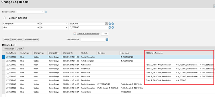 Setting configuration parameter 3008 to Yes triggers ticket generation even though configuration parameter 1008 is deactivated (set to No). However, you are not able to report on the corresponding change log while configuration parameter 1008 is deactivated. Suffice to say that configuration parameter 1008 complements configuration parameter 3008. Activating configuration parameter 3008 alone is not sufficient to generate a change log report for authorization data changes. Figure 19 shows a sample change log report for roles that you can access via the NWBC menu path Reports and Analytics > Audit Reports > Change Log Report.