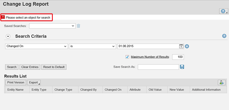 At the minimum, you have to specify two selection criteria. The first mandatory selection criterion that must be defined is the Changed On value (which is displayed by default). Then you can specify other selection criteria, or you receive the error shown in Figure 22.