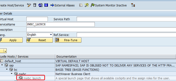 Trick: The ~launch page of NWBC is controlled by the ICF node NWBC_LAUNCH. To ensure that the initial ~launch page is not displayed when you execute transaction NWBC in the command line (SAP Easy Access), the ICF node NWBC_LAUNCH should be disabled via transaction SICF. Figure 26 shows a disabled NWBC_LAUNCH ICF node that can be accessed by following menu path default_host > sap > bc > nwbc > nwbc_launch via transaction SICF.