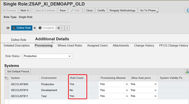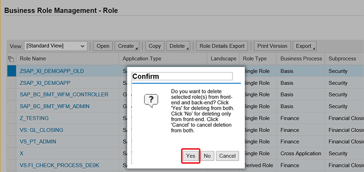 When you choose Yes (delete from both front end and the back end) in the confirmation dialog box, note that the role is deleted directly in all the systems where the role exists. If the role exists in two systems as shown in Figure 31, the role is deleted in the two systems.