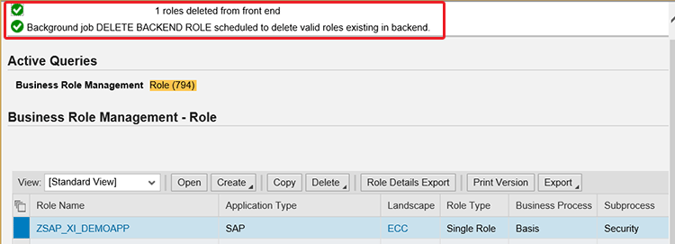 The status message shown in Figure 32 confirms the deletion of the role in the front-end system and the schedule of the background job to delete the role in the back-end system.
